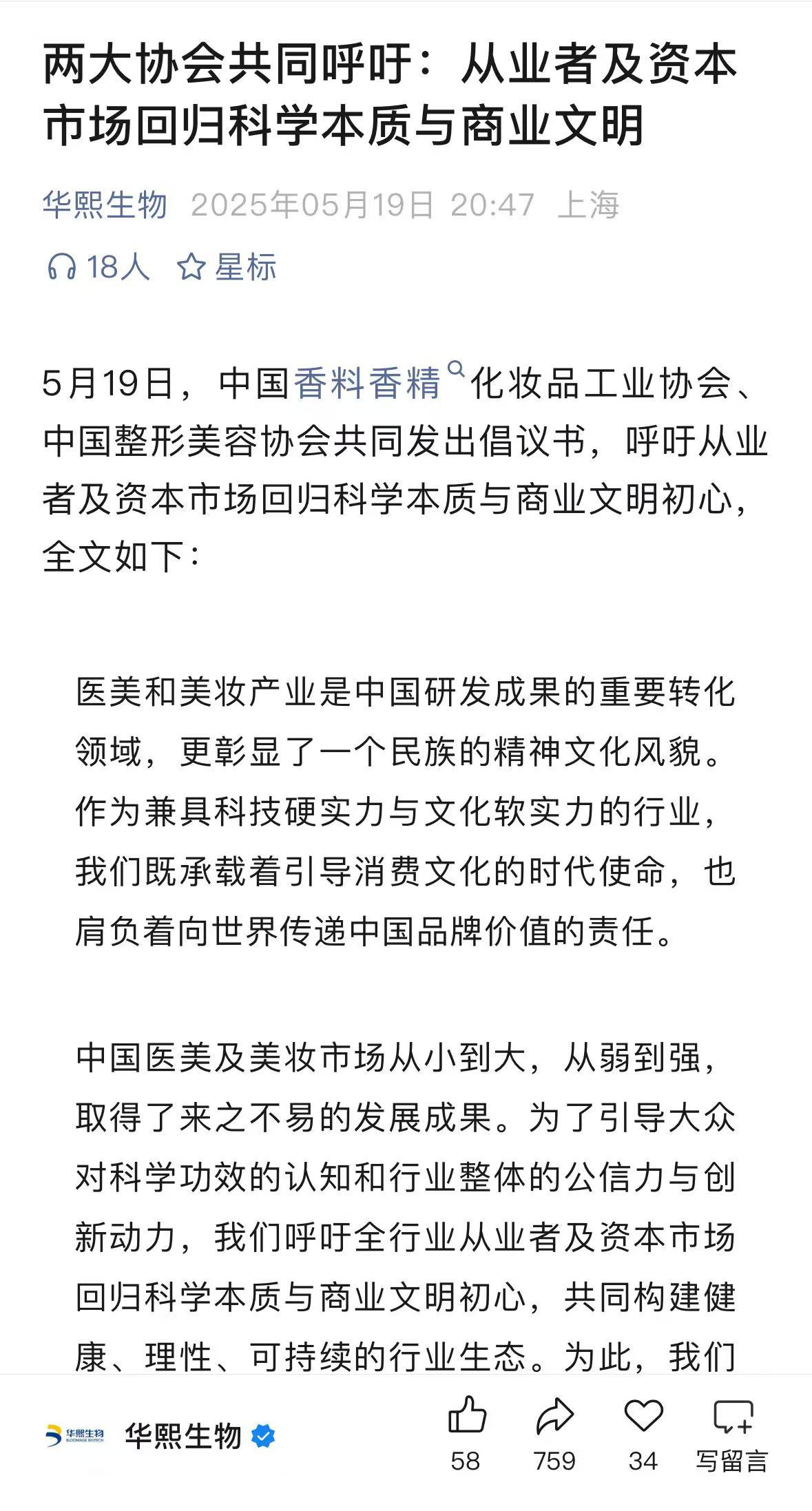 昨晚,中国香料香精化妆品工业协会、中国整形美容协会共同发出倡议书,呼吁从业者及资本市场回归科学本质与商业文明初心,并表示希望更多同行响应本倡议,以科学敬畏之心、商业向善之志,共同捍卫行业的尊严与未来。