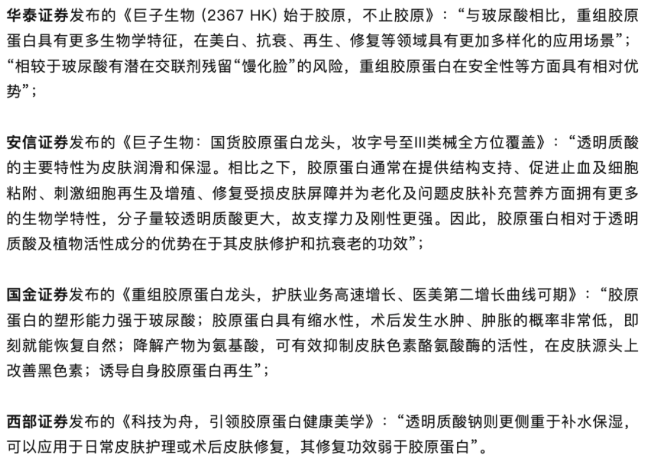 华熙生物在微信文章中表示,2022年开始,随着资本市场不断追求新的公司题材,重组胶原蛋白概念被看似幸运地选中了。为了营造比透明质酸产业更大的预期,围绕某重组胶原企业的研报中,出现了大量直接针对中国透明质酸产业的所谓“对比研究”。