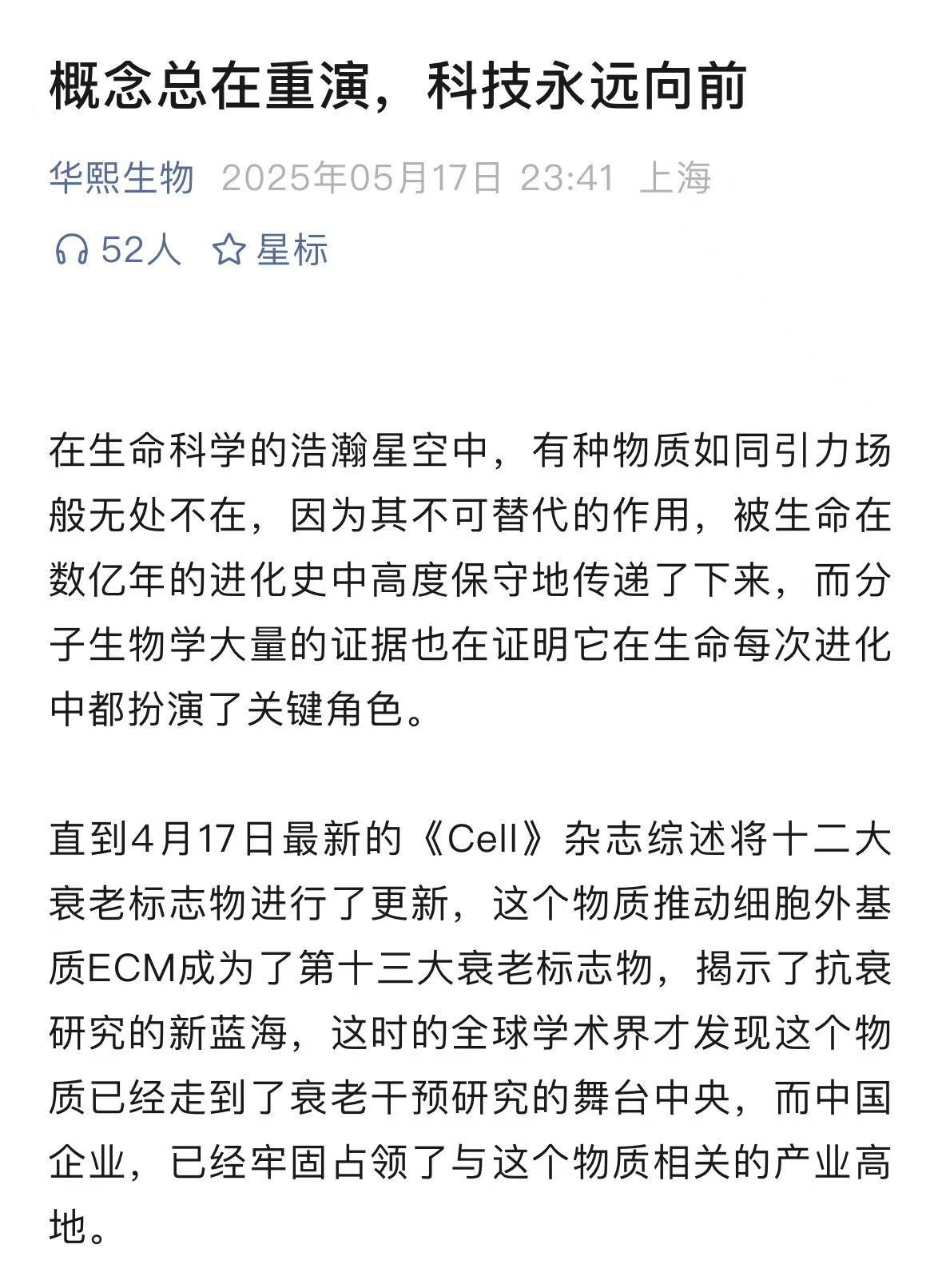5月17日深夜11点,全球最大透明质酸(玻尿酸)研发、生产及销售企业华熙生物在公众号发布了一篇“战斗檄文”《概念总在重演,科技永远向前》。